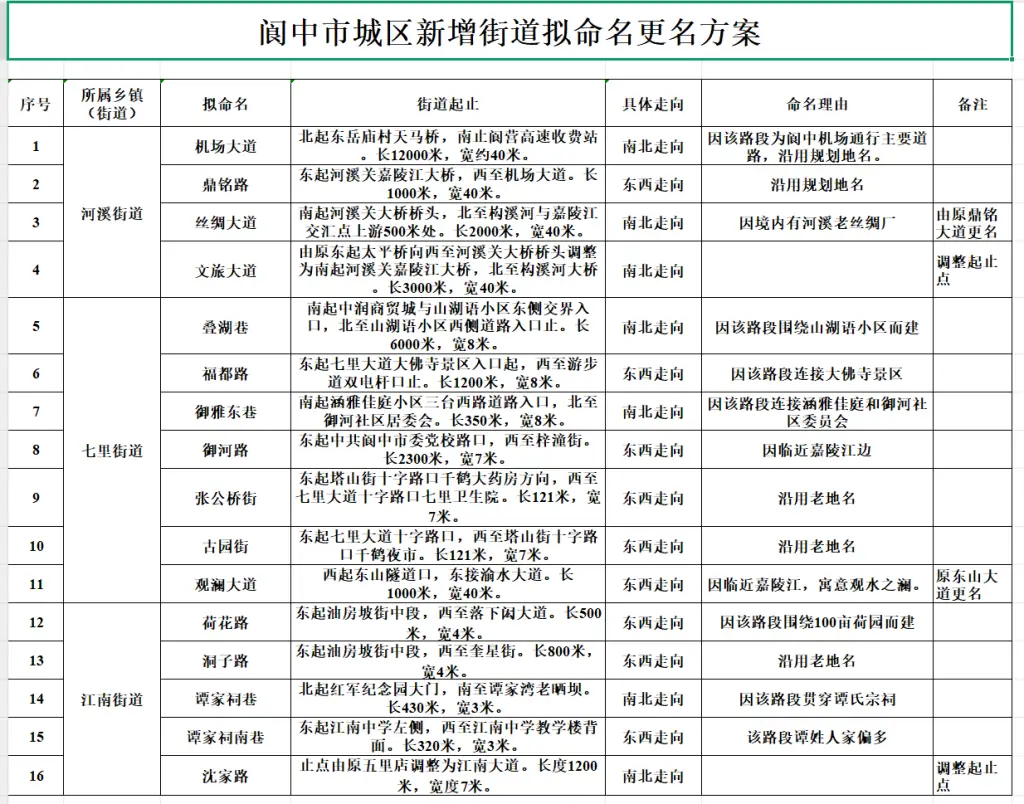 为推进我市地名标准化进程,提高地名管理水平,促进地名更好的服务于乡村振兴、社会发展和人民群众生产生活。根据国务院《地名管理条例》有关规定,现对阆中市城区16条街道和沙溪街道、木兰镇、天宫镇、飞凤镇等11个乡镇(街道)197条乡村道路拟命名更名的初步方案进行公示,公示期为2025年9月10日至10月27日,共30个工作日。