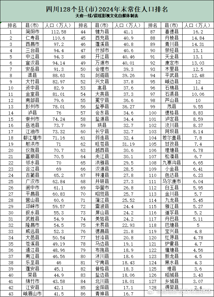 人口数据不仅是城市规模的“晴雨表”,更是经济潜力的“风向标”。近日,一份备受关注的《四川128个县(市)2024年末常住人口排名》在网络流传。