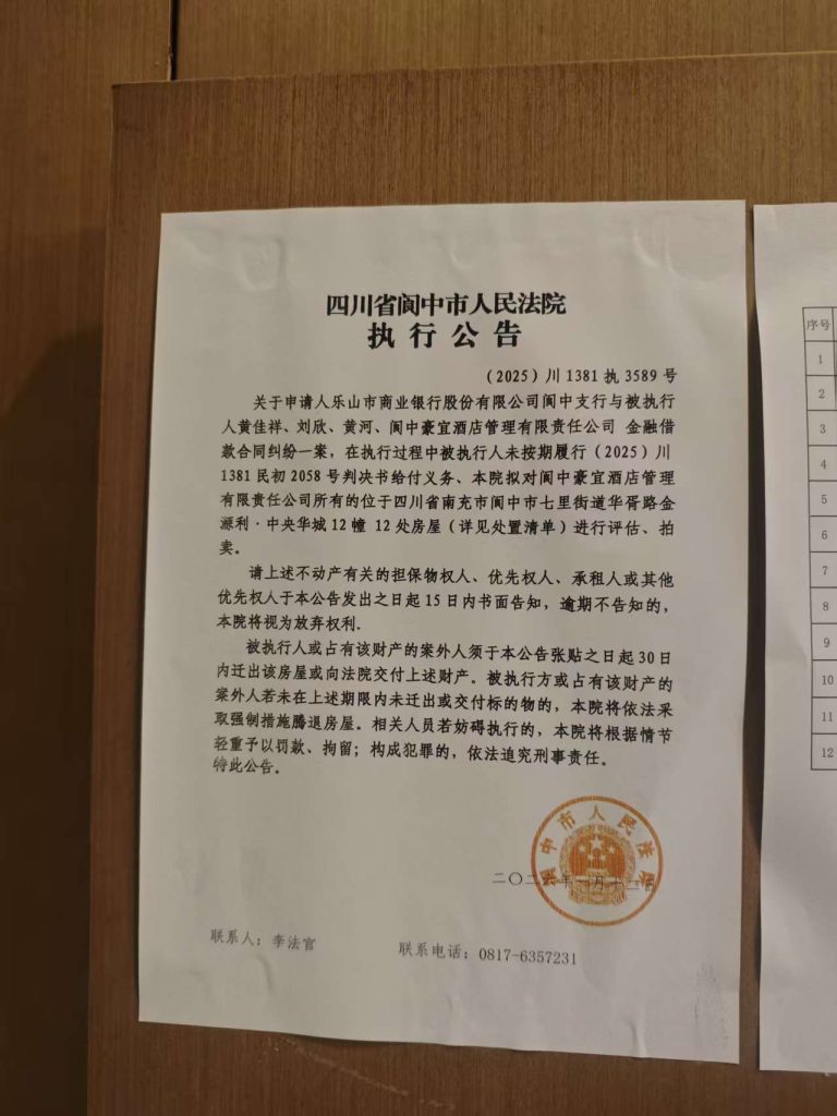 本次执行案号为 (2025)川1381执3589号,涉及申请人乐山市商业银行股份有限公司阆中支行与被执行人黄佳祥、刘欣、黄河及阆中豪宜酒店管理有限责任公司的金融借款合同纠纷。