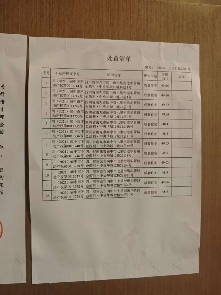 - 执行标的:拟对位于四川省南充市阆中市七里街道华胥路金源利·中央华城12幢的12处成套住宅(总面积约580平方米)进行评估和拍卖。