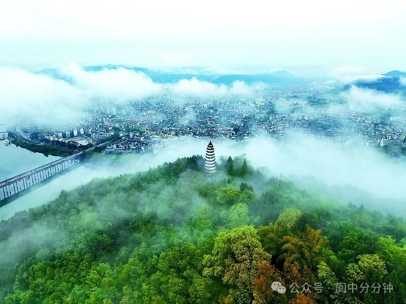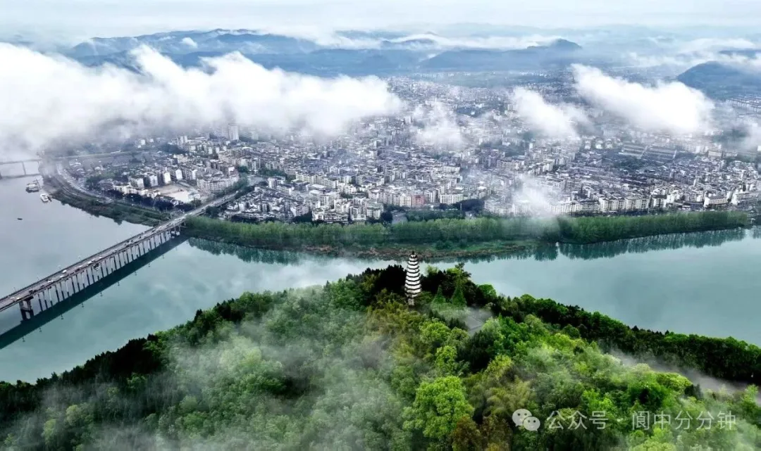 4 月 8 日清晨,一场春雨悄然停歇,四川阆中古城被轻柔云雾层层包裹,宛若仙境降临人间。高空俯瞰,白塔公园内古树抽新绿、生机盎然,巍峨白塔矗立山巅,与云雾中的古城交相辉映,勾勒出一幅绝美的春日水墨画卷。